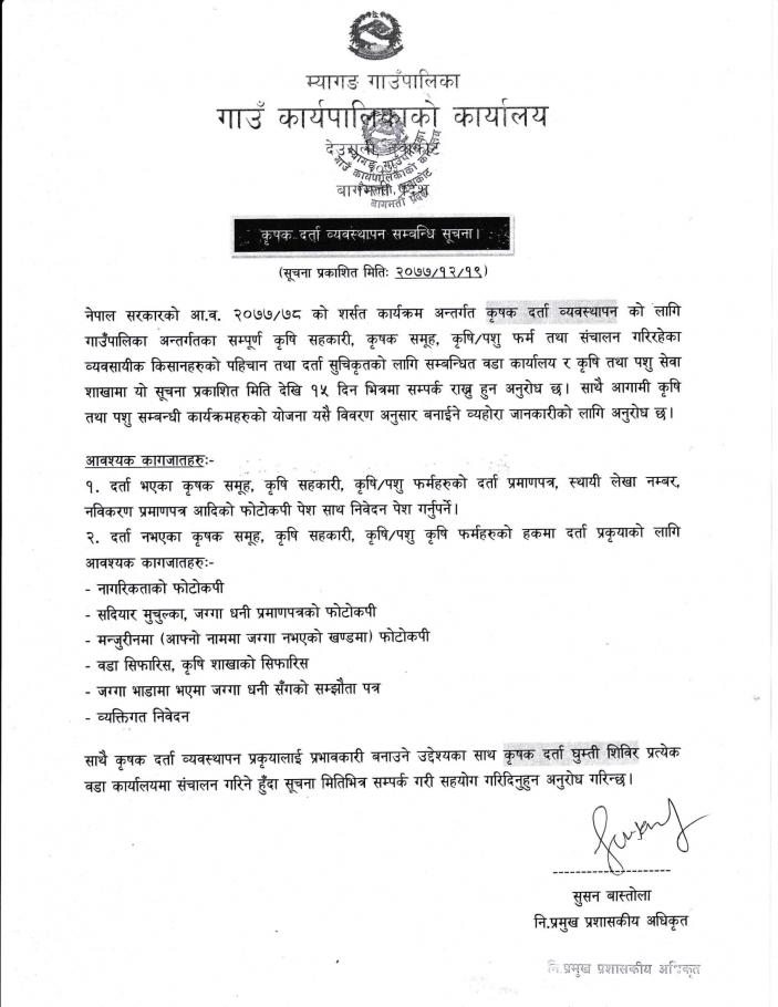 कृषक दर्ता व्यवस्थापन सम्बन्धी सूचना ।