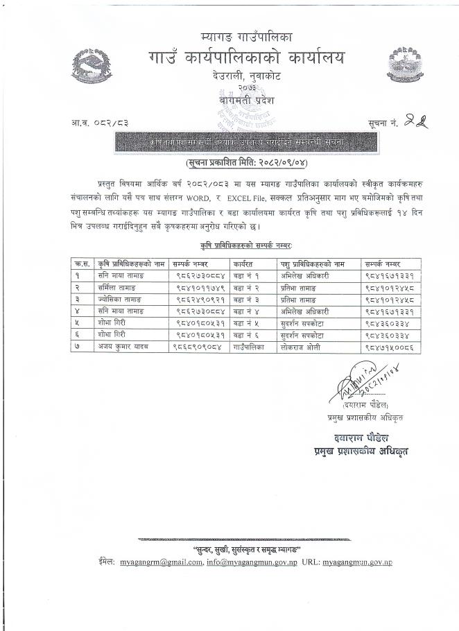 कृषि तथा पशु सम्बन्धी तथ्याङ्क उपलब्ध गराईदिने सम्बन्धी सूचना !
