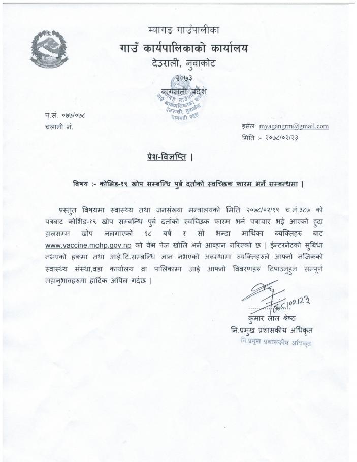 कोभिड १९ खोप सम्बन्धी पुर्व दर्ताको स्वच्छिक फारम भर्ने सम्बन्धी प्रेश विज्ञप्ती।