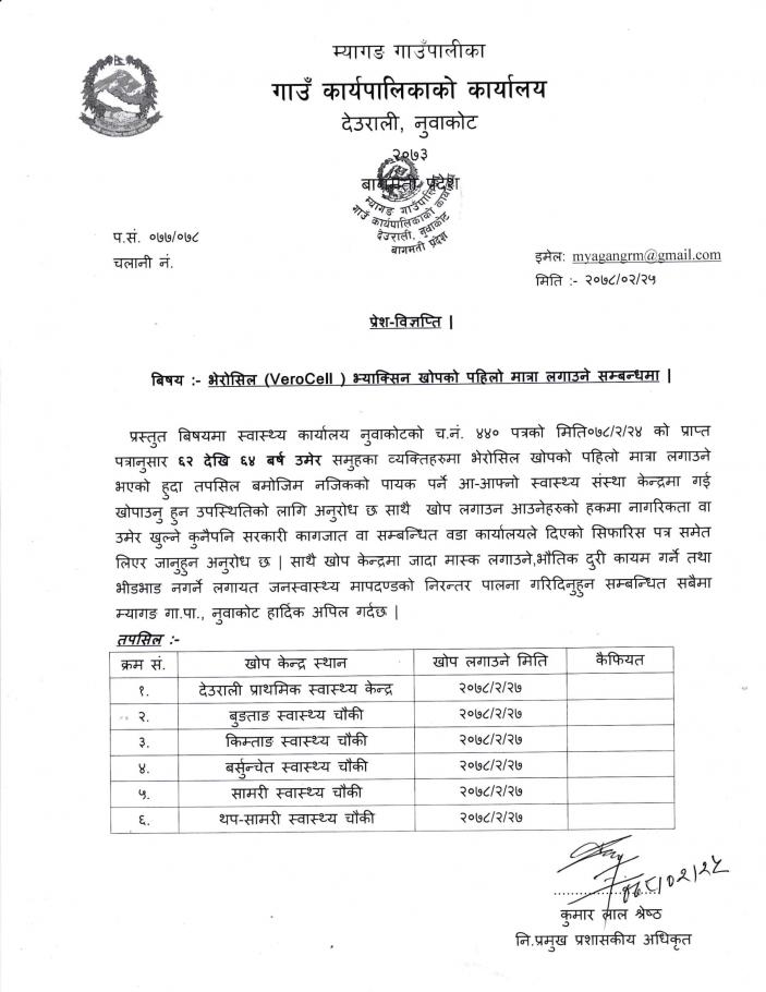 भेरोसिल भ्याक्सिन खोपको पहिलो मात्र लगाउने सम्बन्धी प्रेस विज्ञप्ती!