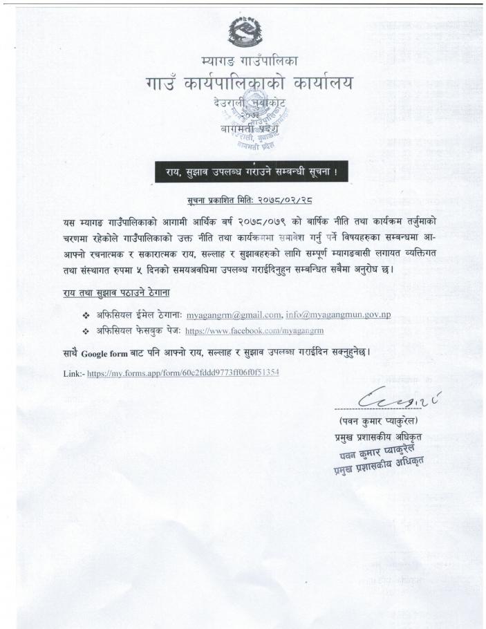 यस म्यागङ गाउँपालिकाको आगामी आर्थिक बर्ष २०७८/०७९ को बार्षिक नीति तथा कार्यक्रम तर्जुमाको चरणमा रहेकोले गाउँपालिकाको उक्त नीति तथा कार्यक्रममा समावेश गर्नु पर्ने विषयहरुका सम्बन्धमा आ-आफ्नो रचनात्मक र सकारात्मक राय, सल्लाह र सुझावहरुको लागि सम्पूर्ण म्यागङबासी लगायत व्यक्तिगत तथा संस्थागत रुपमा ५ दिनको समयअवधिमा उपलब्ध गराईदिनुहुन सम्बन्धित सबैमा अनुरोध छ।