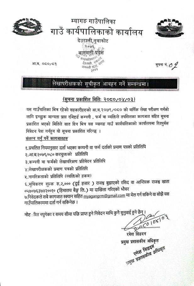 लेखापरिक्षकको सुचिकृत आव्हान गर्ने सम्बन्धि सूचना।