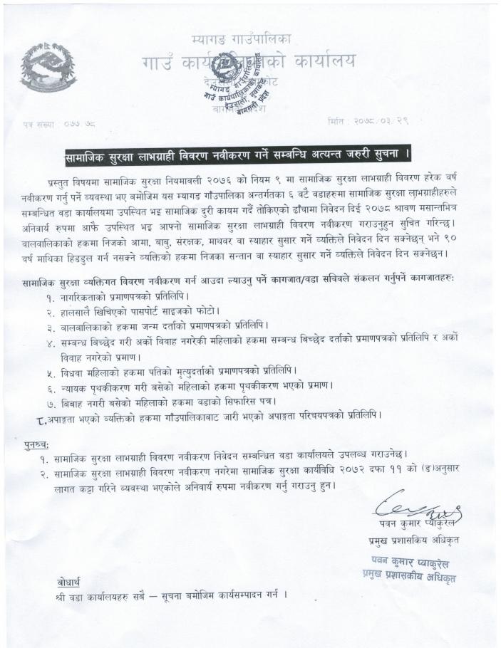 सामाजिक सुरक्षा लाभग्राही विवरण नविकरण गर्ने सम्बन्धी अत्यन्त जरुरी सूचना!