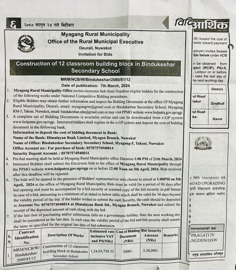 Invitation for Bids - Construction of 12 classroom building block in Bindukeshar SS